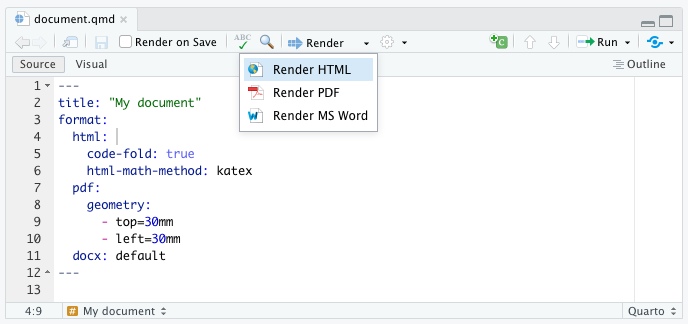 In this tutorial we’ll show you how to author Quarto documents in RStudio. In particular, we’ll discuss the various document formats you can produce with the same source code and show you how to add components like table of contents, equations, citations, etc. The visual markdown editor in RStudio makes many of these tasks easier so we’ll highlight its use in this tutorial, but note that it’s possible to accomplish these tasks in the source editor as well.